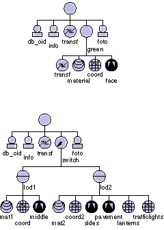 Die Umsetzung der unterschiedlichen levels-of-detail im Planungstool erfolgt über Mechanismen in den neu definierten Objektklassen (NodeKits) innerhalb der Inventorstruktur. Durch Umschalten kann zwischen unterschiedlichen LODs gewählt werden. Eine Umsetzung von Stadtstrukturen in NodeKits wurde für folgende Grundobjekte vorgenommen: